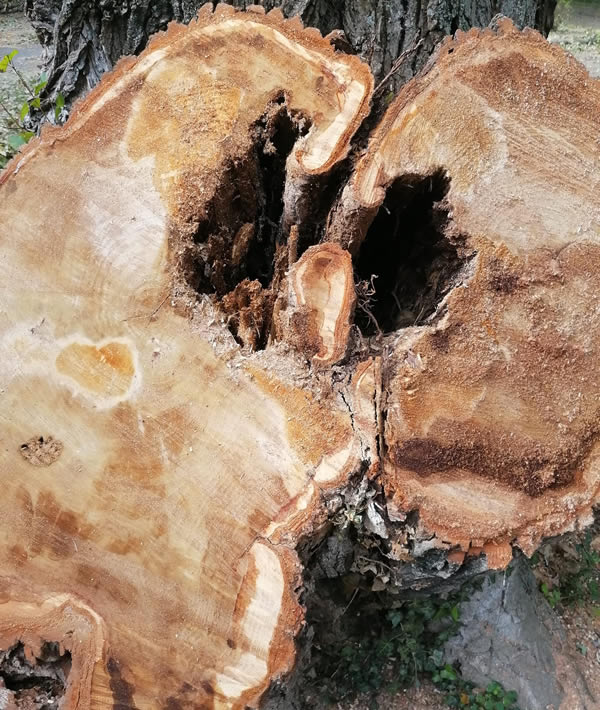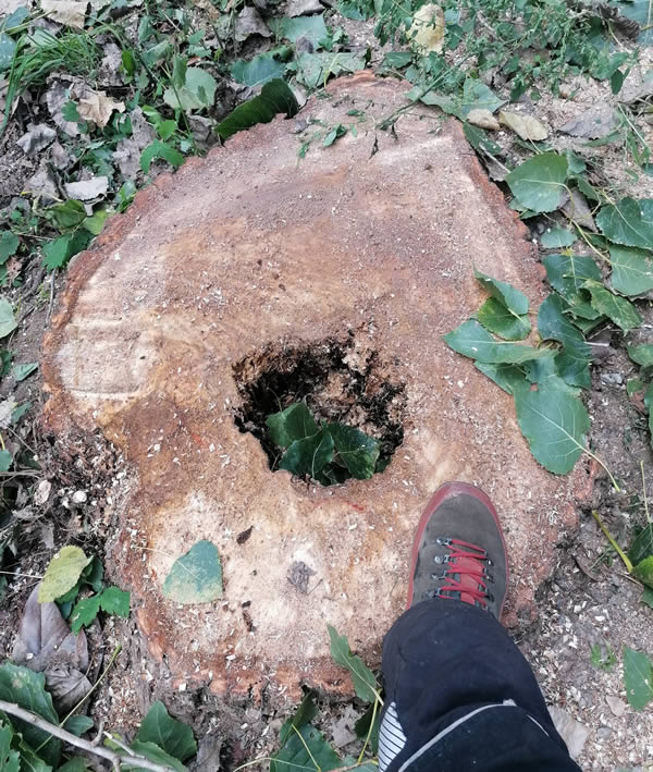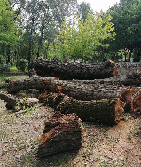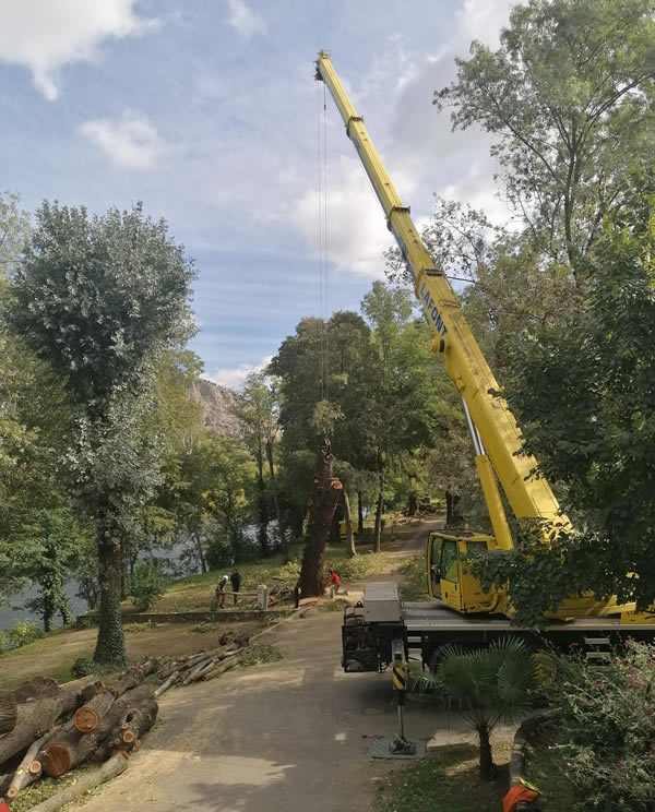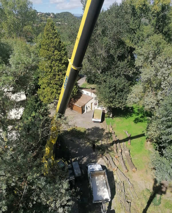 Démontage à la grue de six peupliers atteints de champignons et devenus potentiellement dangereux pour les vacanciers et les infrastructures du camping.