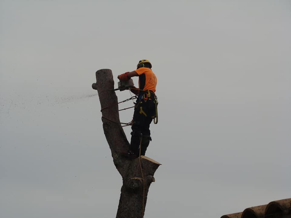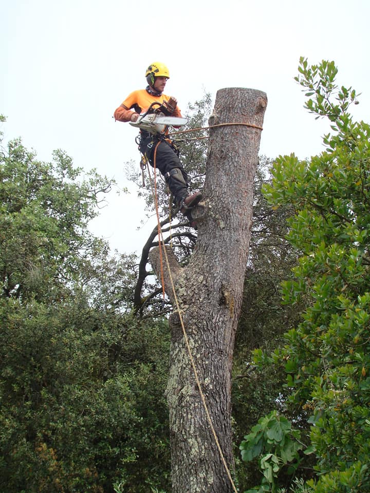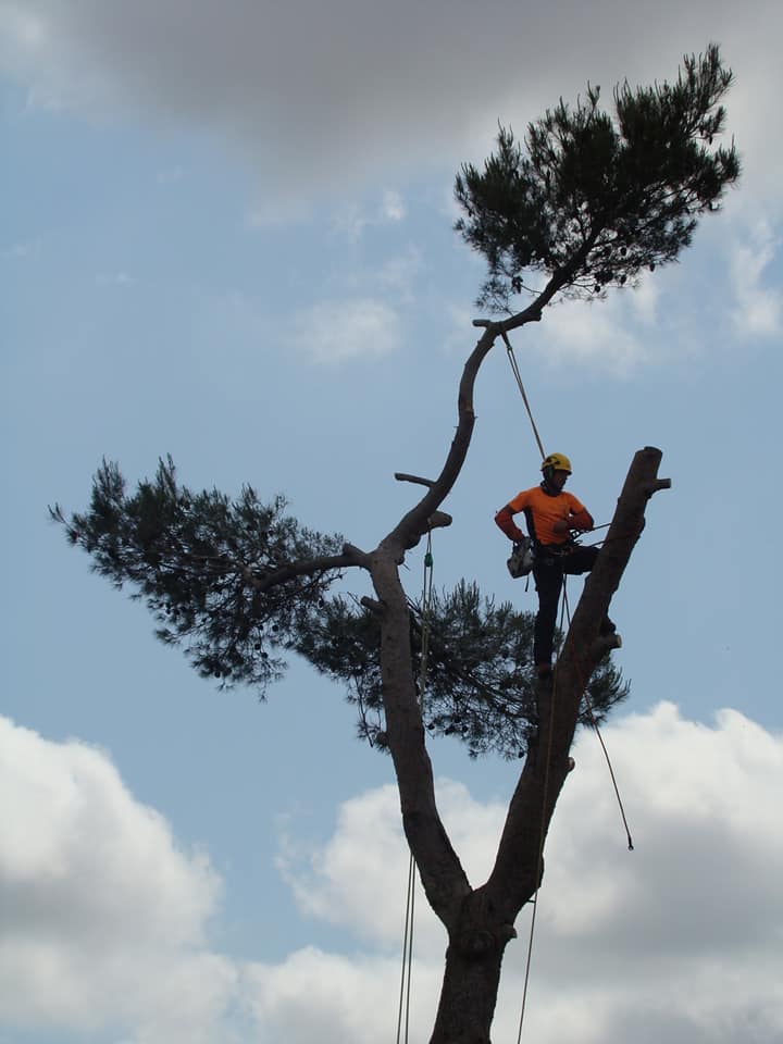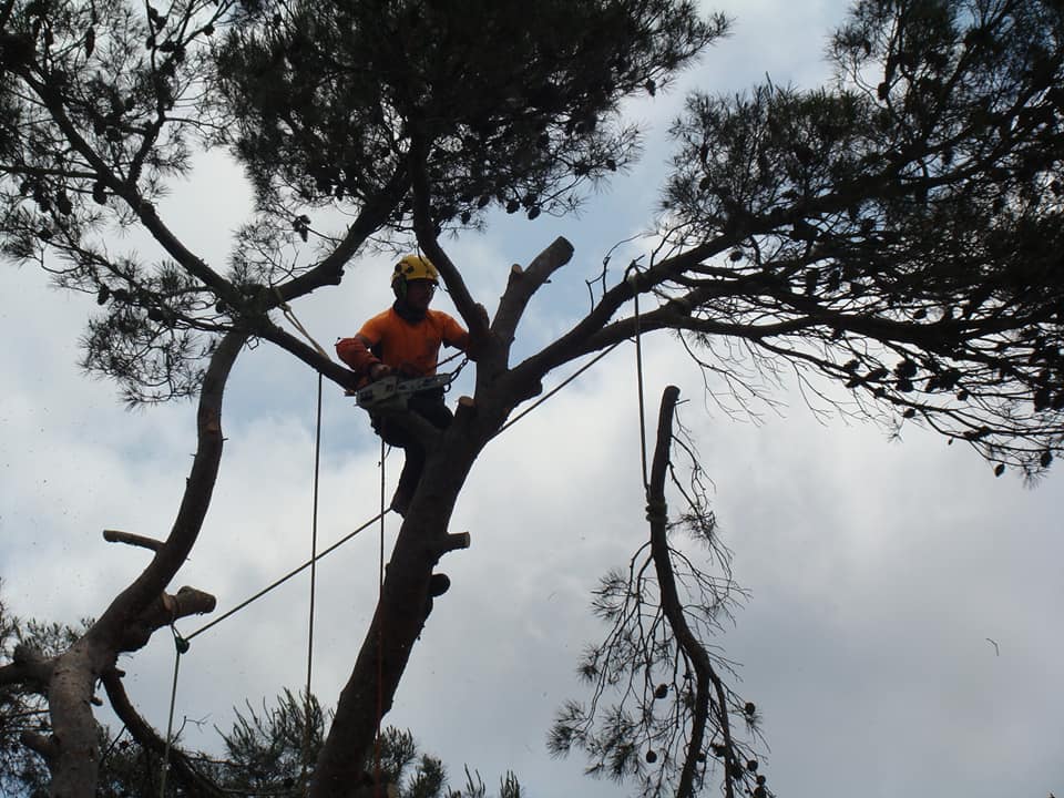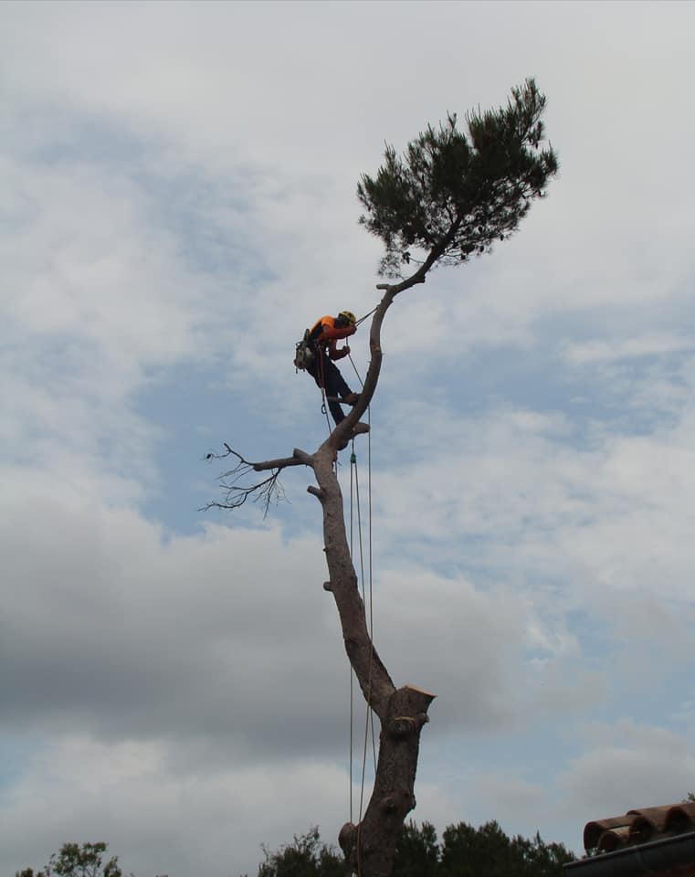 Abattage par démontage en rétention jusqu’au dernier morceau pour ce Pin d’alep en surplomb de clôture et de massifs.